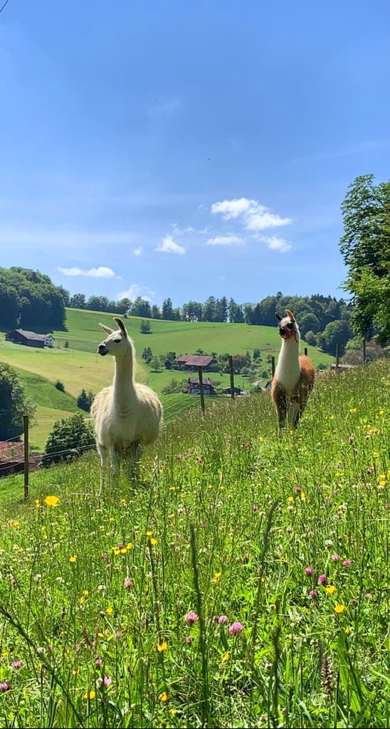 Auch Samiras Lamas Samara (braun-weisse Stute) und Santos (weisser Hengst) gehören zu unserem Betrieb.